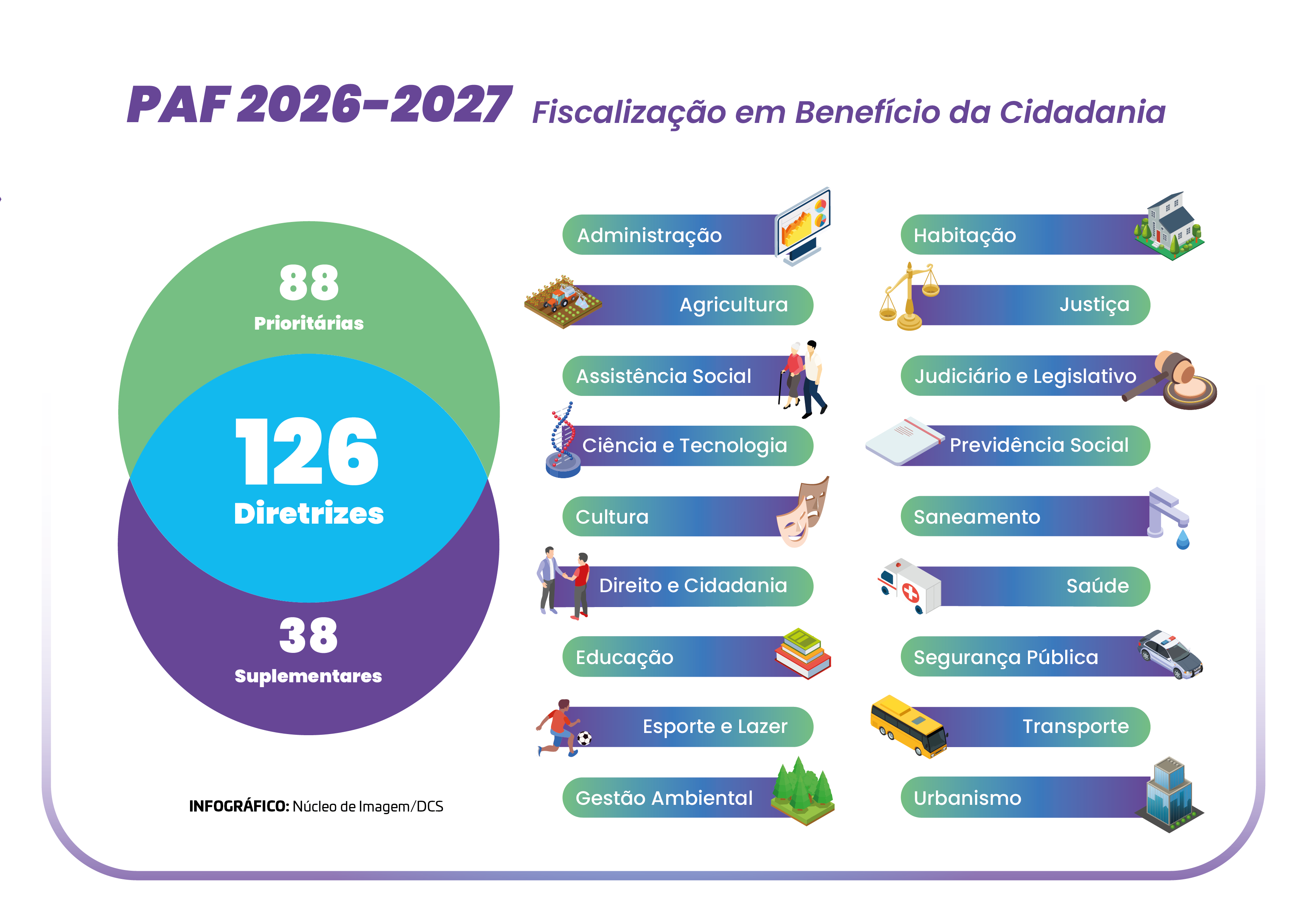 PAF 2026-2027 - InfográficoBaixar ArquivoLegendaAs 18 áreas da gestão pública incluídas no Plano de Fiscalização 2026-2027 do TCE-PRCréditosNúcleo de Imagem/Diretoria de Comunicação Social - TCE-PR