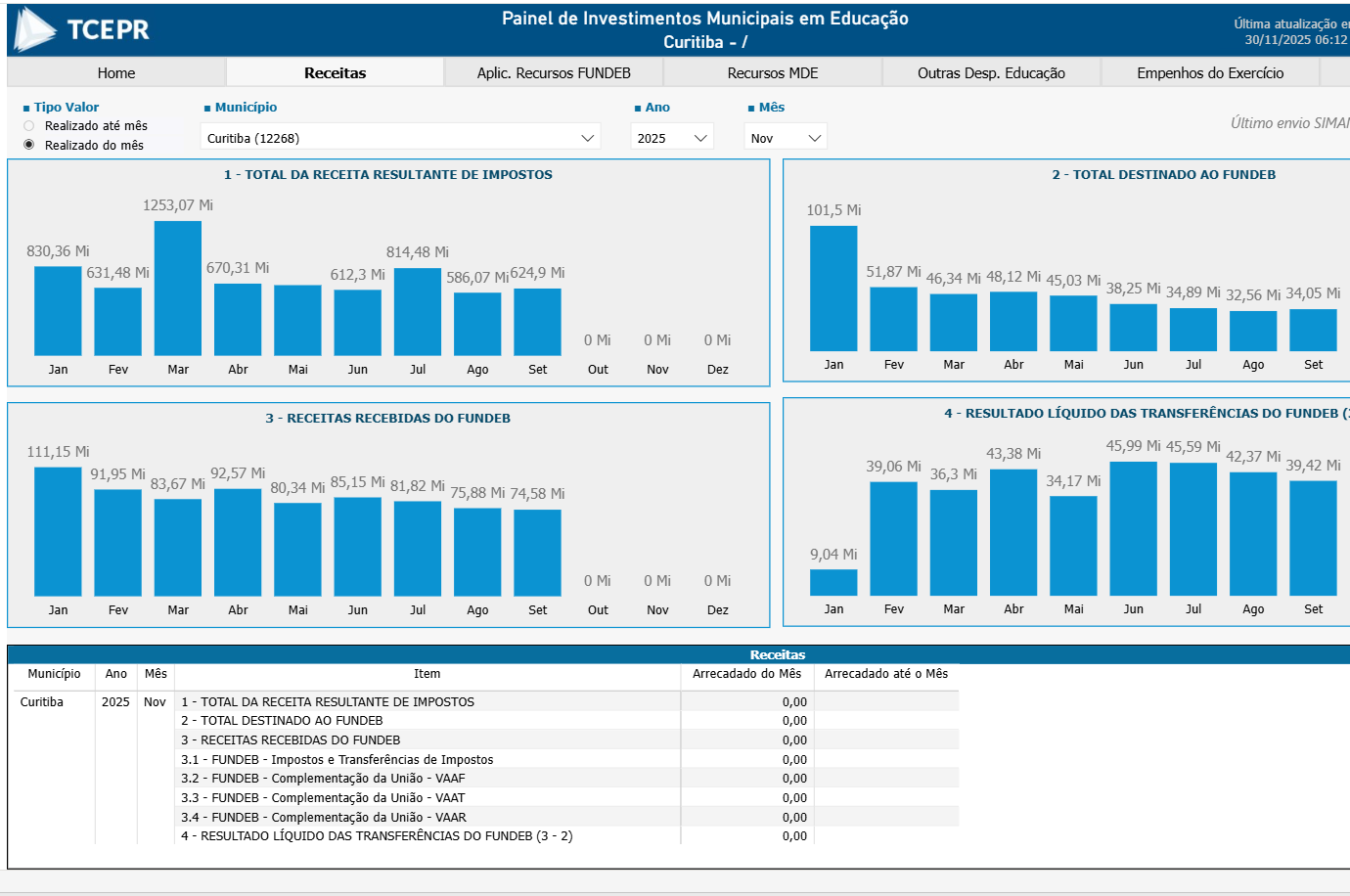 Painel de Investimentos Municipais em EducaçãoBaixar ArquivoLegendaReceitas da área da Educação do Município de Curitiba em novembro de 2025, aferida no Painel de Investimentos Municipais em EducaçãoCréditosDivulgação/TCE-PR