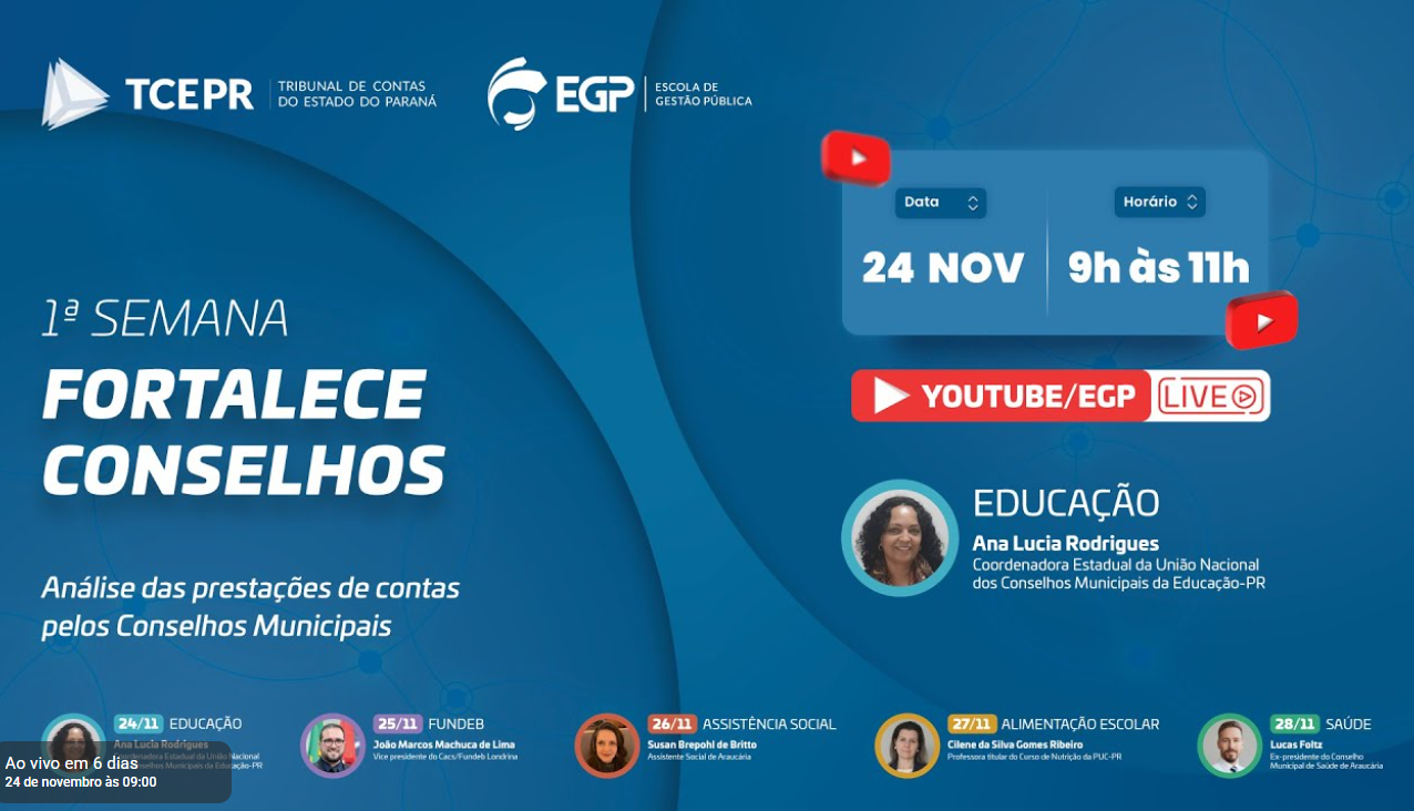 Primeira Semana Fortalece Conselhos.pngBaixar ArquivoLegenda"1ª Semana Fortalece Conselhos" será realizada entre 24 e 28 de novembro, das 9 às 12h, pelo YouTube do TCE-PRCréditosNúcleo de Imagem/Diretoria de Comunicação Social - TCE-PR